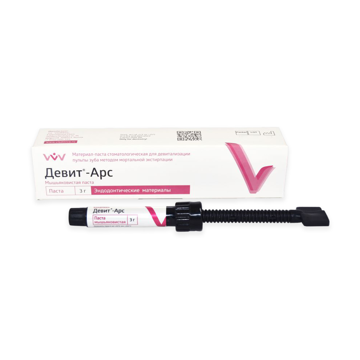 Материал-паста стоматологическая для девитализации пульпы зуба методом мортальной экстирпации «Девит Арс» по ТУ 9391-075-45814830-2002.